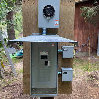 Our most recently completed RV service ready for hookup. Here we have a 200A meter base feeding a 200A panel. The panel feeds a 50A receptacle and a GFCI-protected 20A receptacle. The panel and receptacles are housed in weatherproof enclosures provided by Valid Manufacturing Ltd. As requested by the customer there is plenty of room on this service for future upgrades.